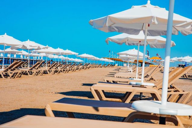 — Частный пляж с пирсом, шезлонгами и баром