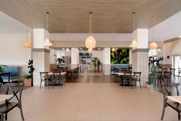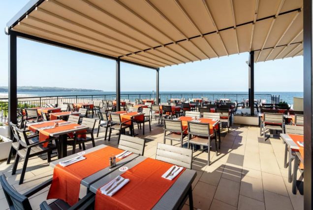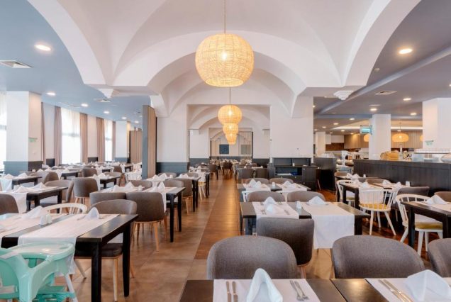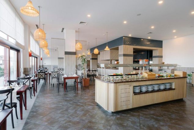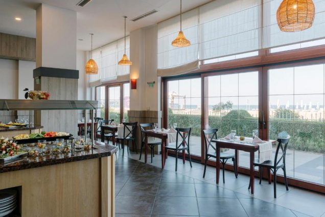 Основной ресторан: The Helios Restaurant — средиземноморская и болгарская кухня с панорамой на море; подача с 07:00 до 10:30