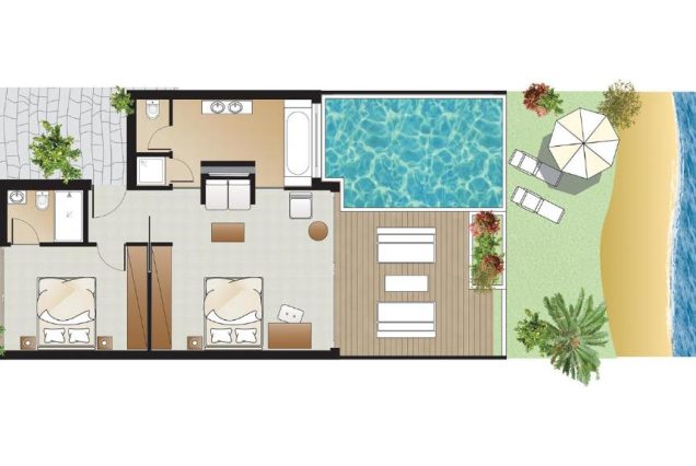 — Утро на частном пляже: шезлонги, купание, коктейль у воды