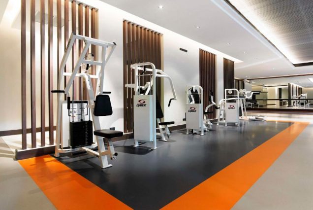 — Фитнес-центр: современный тренажёрный зал с видом на сад, зона функциональных тренировок