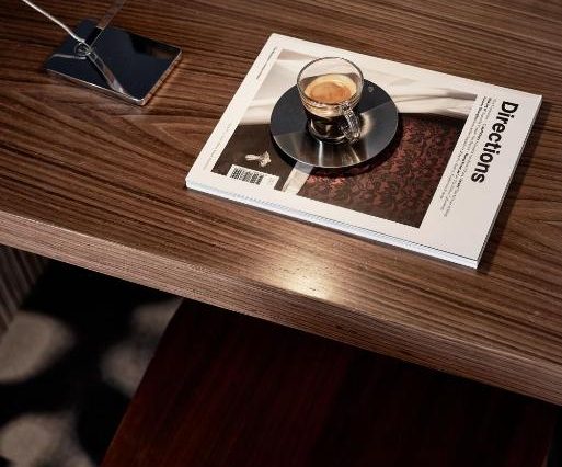 Интерьер: современный минимализм, натуральное дерево, тёмный мрамор, дизайнерские кресла