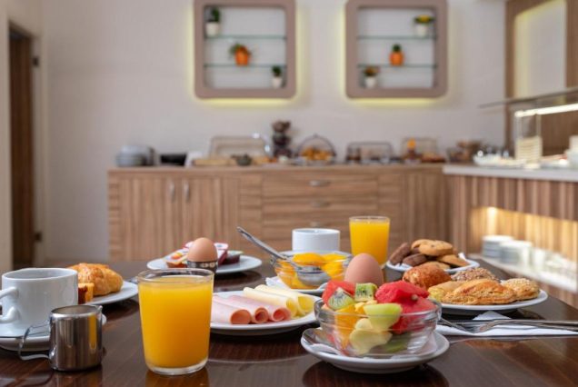 Завтрак включён (BB): континентальный шведский стол с хлебом, выпечкой, джемами, сыром, яйцами, йогуртом, фруктами, кофе, чаем и соком — 07:00–10:00