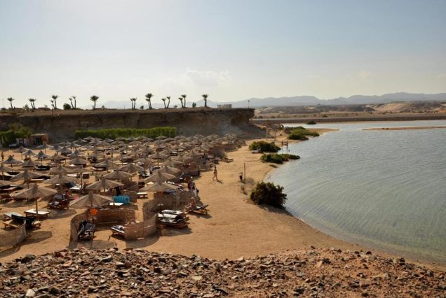 Пляж: бухта Jabal Al Rosas — песчано-коралловый вход, лагуна, лежаки и зонты