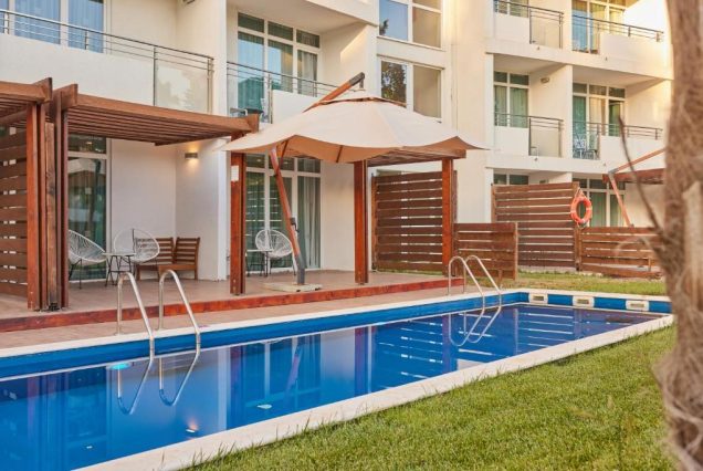 — Частный пляж: песчаная и галька, шезлонги, зонты, пляжные волейбольные сетки и место для прогулок по побережью.