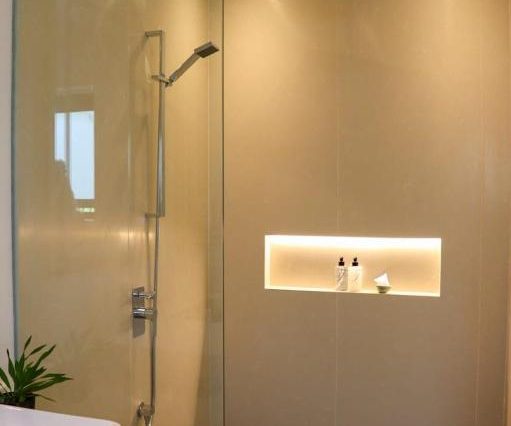 Санузел: душевая кабина под открытым небом, ванна, органическая косметика