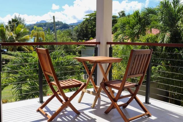Терраса: кресла, столик, подвесной гамак, тень от пальм