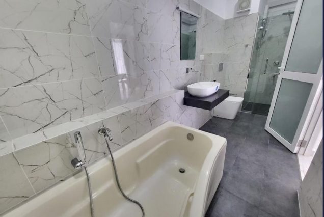 Санузел: ванна из камня с видом на сад, тропический душ, двойная раковина