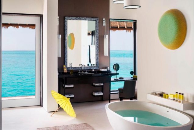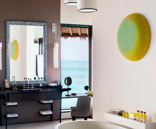 Санузел: мраморная ванна с видом на воду, тропический душ, косметика Guerlain