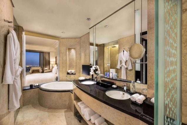 — Ванная комната: мраморная отделка, ванна и душ, халаты, тапочки, фен, косметика премиум-класса
