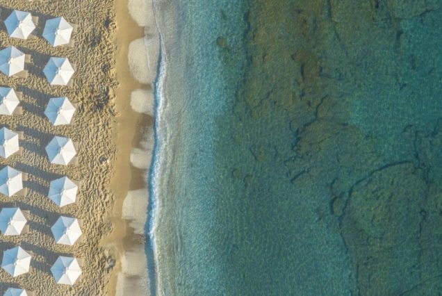 — Лежаки на пляже, тёплая вода Эгейского моря, шум прибоя