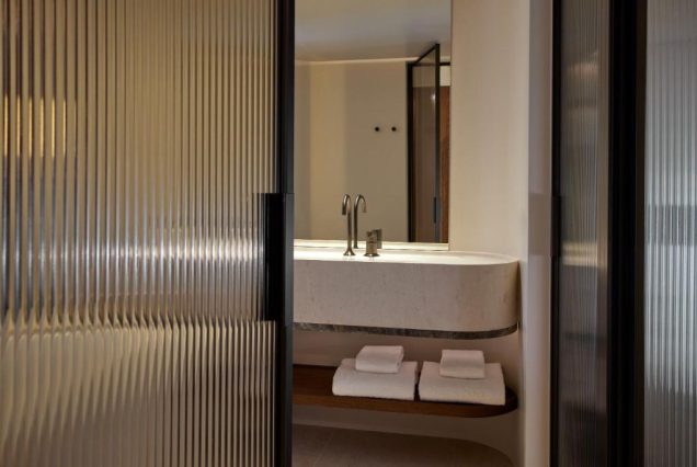 — Санузел: мраморная ванная комната • душ с тропическим режимом • двойная раковина • зеркало для макияжа • брендовая косметика • халаты и тапочки