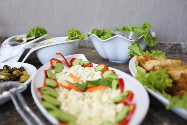 Меню: свежая выпечка, фрукты, яйца, сыры, традиционные лепёшки, оливки, гранатовые соусы