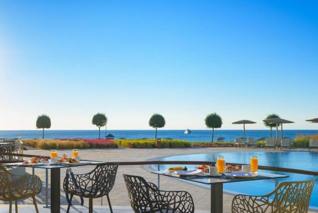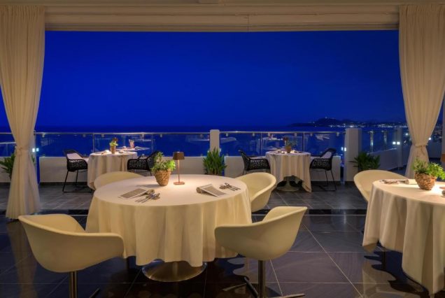 Основной ресторан: The Aegean Restaurant — греческая и средиземноморская кухня с панорамой на море; подача с 07:00 до 10:30