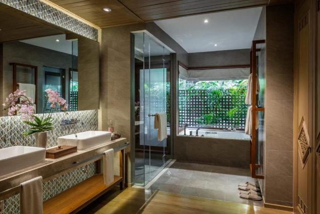 Санузел: ванна с видом, тропический душ, мраморная отделка