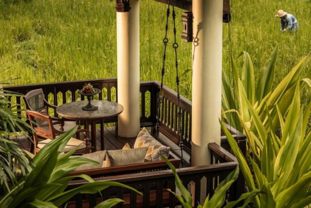 Терраса: меблированная, с навесом, мягкими креслами, видом на рисовые поля