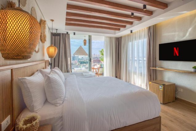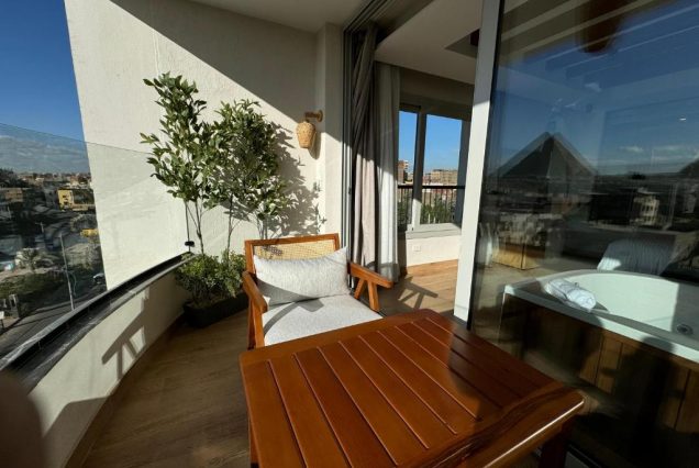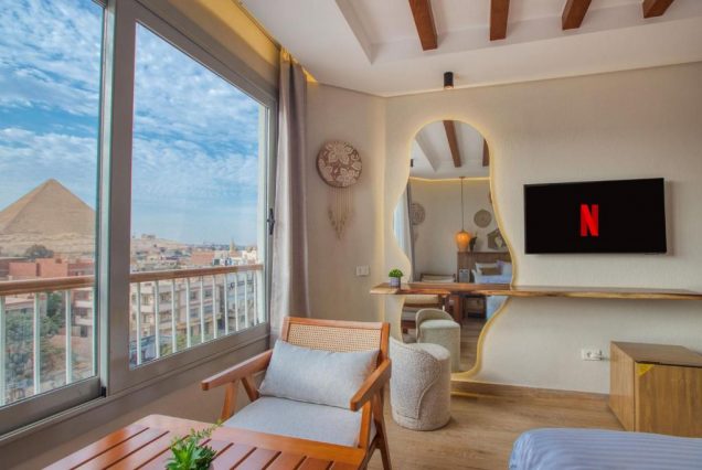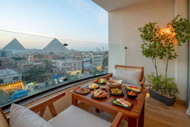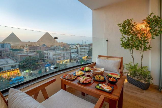 Панорама и архитектура: открытые виды на пирамиды и пустыню, современный дизайн с восточными мотивами, просторные балконы