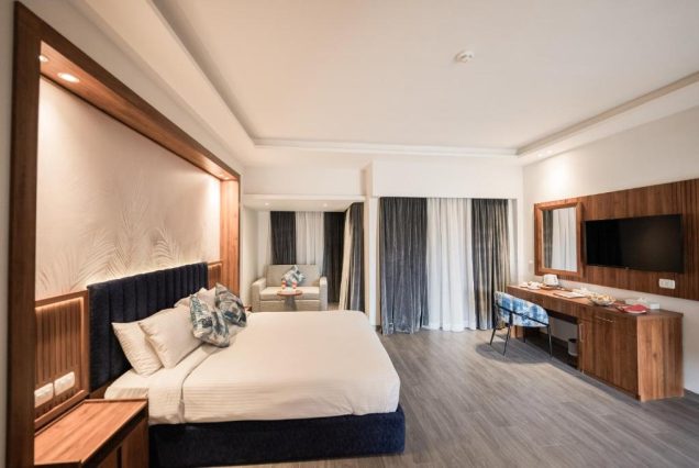 Площадь и планировка: просторный номер с современным дизайном, светлые стены, большие окна с видом на сад, бассейн или море, удобная зона для работы и отдыха, мини-сейф для ценных вещей