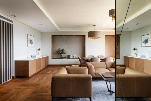 • Интерьер: стекло, дерево, мягкие тона, акценты латунью