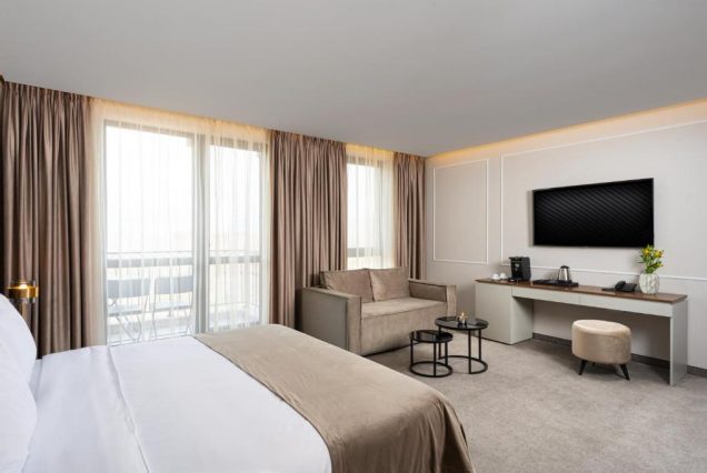 Мені сподобалося відчуття розкоші та чистоти. Я забронював стандартний номер, а коли ми приїхали до готелю, нас поселили в двомісний номер класу «люкс» з величезною терасою за ту ж ціну. Номер був великий і надзвичайно чистий, зі зручним двоспальним ліжком. Ванна кімната була величезною з усім необхідним приладдям. На території готелю є велика безкоштовна парковка, відкритий басейн з шезлонгами. Спа-центр — один з найкращих і добре обладнаних, які я коли-небудь відвідував. Є два мінеральні басейни, один з яких відкритий з гідромасажем. Ресторан розкішний, достатньо великий і пропонує смачну та різноманітну їжу. Протягом усього перебування мені не довелося чекати на столик або відчувати, що людей забагато. Я б повернувся ще раз. Рекомендую!