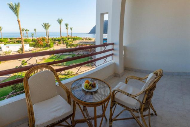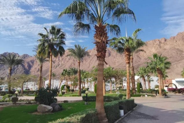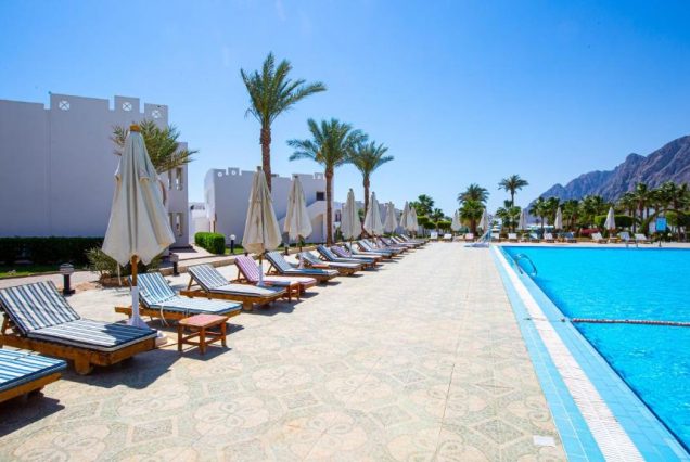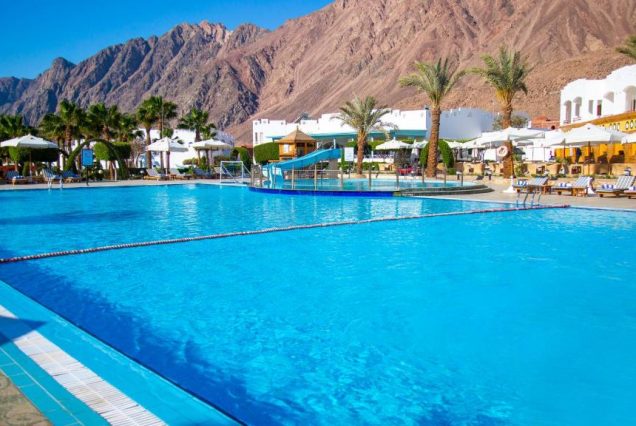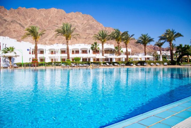 Панорама и архитектура: вид на море и Синайские горы, просторный комплекс, зелёные сады, бассейны и пляж с коралловым рифом