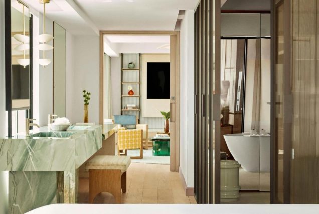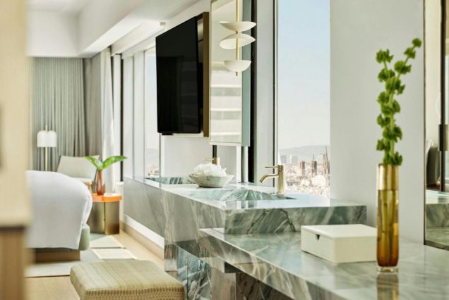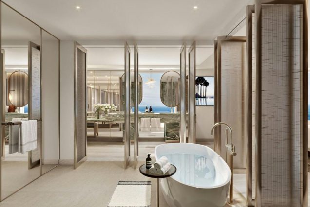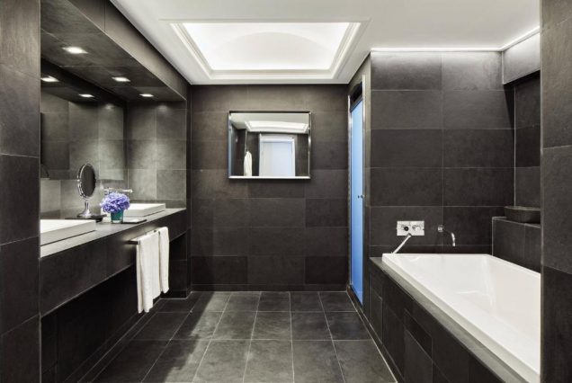 Санузел: мраморная ванна с видом, отдельная душевая, биде