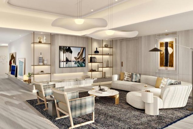 Интерьер: элегантный современный стиль, панорамные окна от пола до потолка