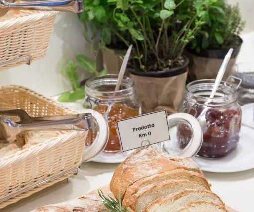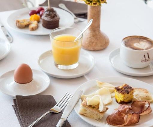 Меню: круассаны, хлеб, прошутто, сыр, йогурты, яйца, мюсли, сезонные фрукты, свежевыжатые соки, кофе