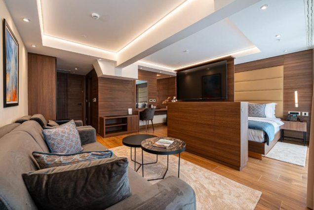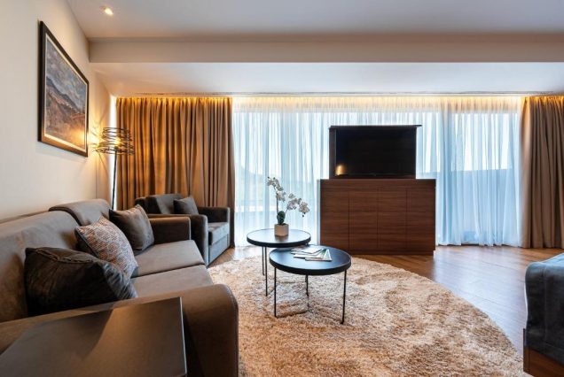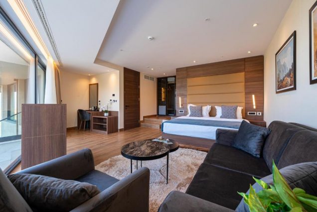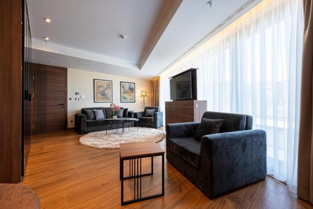 Оснащение: Smart TV, Bluetooth-колонка, кофемашина Nespresso, чайный набор, мини-бар, сейф, гладильные принадлежности