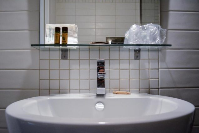 Ванная: душевая кабина, фен, косметика, полотенца