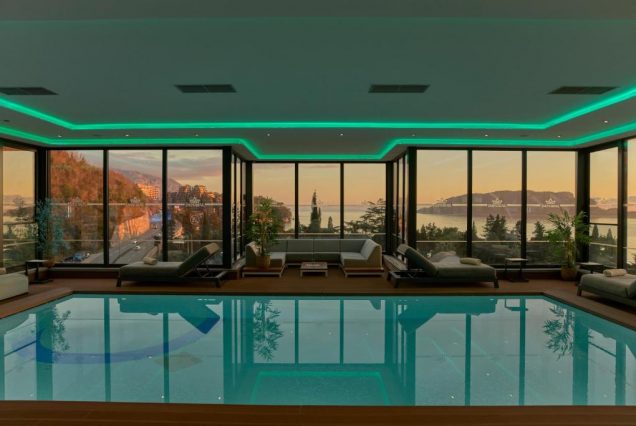 Бассейны: крытый и открытый с видом, зона отдыха, обслуживание у воды