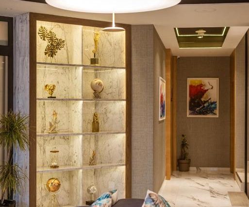 Интерьер: современный элегантный стиль, натуральное дерево, мрамор, мягкое освещение