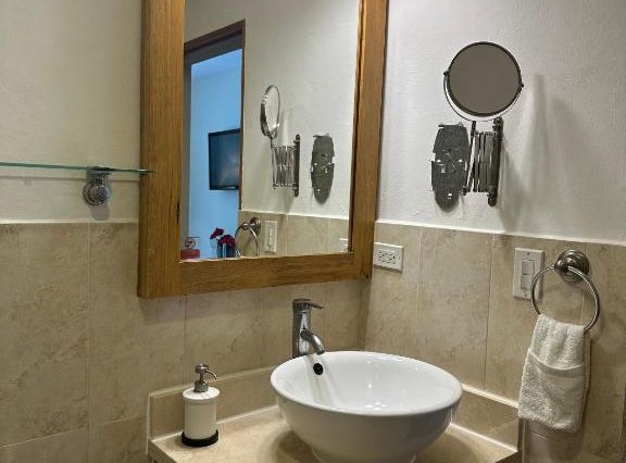Санузел: ванна с видом, душевая, двойная раковина, тропический душ