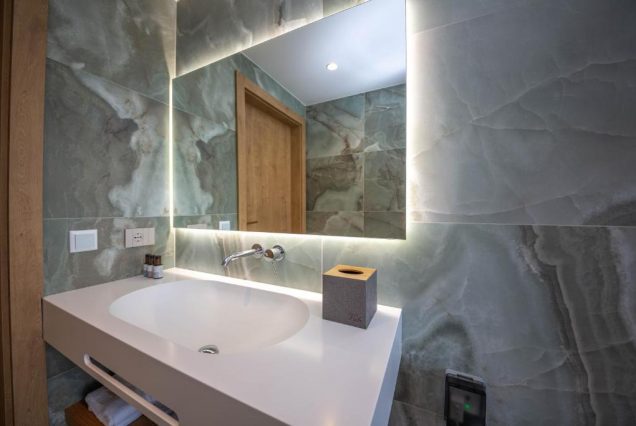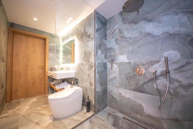 Санузел: ванна с гидромассажем, душевая кабина с тропическим душем, двойная раковина, биде