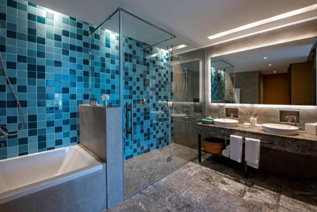 Санузел: ванна с видом, душевая с тропическим душем, двойная раковина, биде