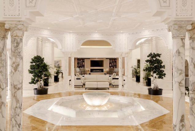 Панорама и архитектура: пальмовые рощи, песчаные пляжи, белоснежные корпуса отеля с элементами арабской архитектуры, просторные сады