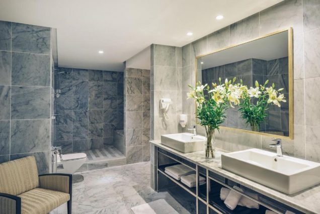 Санузел: просторная ванна, душевая кабина с гидромассажем, двойная раковина, туалет