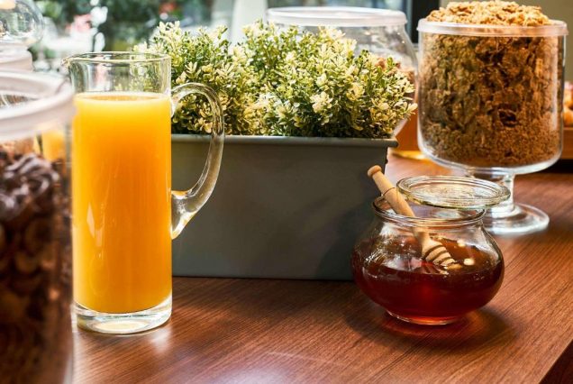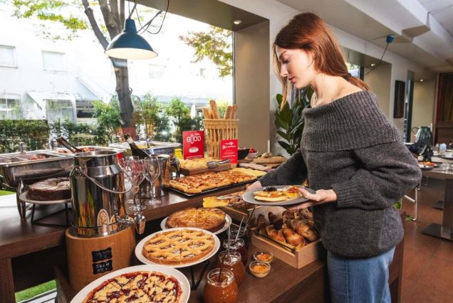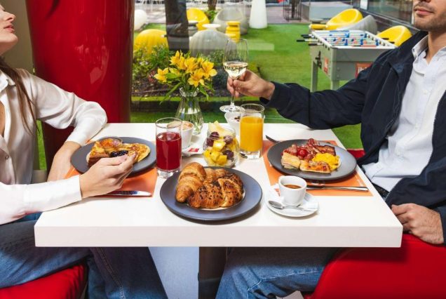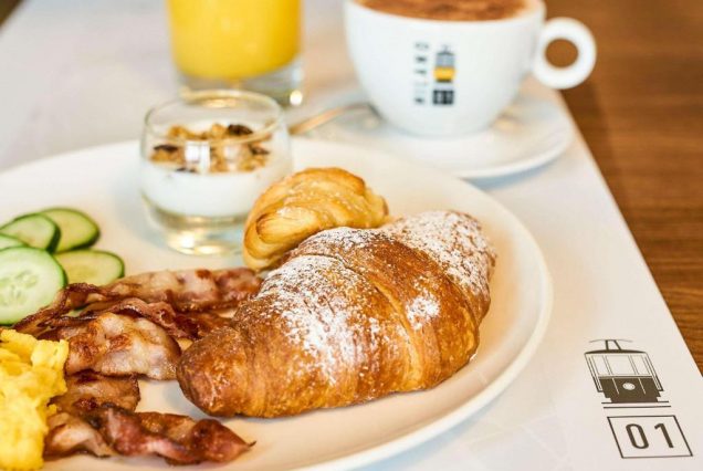 Меню: круассаны, булочки, хлеб, тосты, мёд, джемы, яйца, бекон, ветчина, сыр, фрукты, злаки, йогурт
