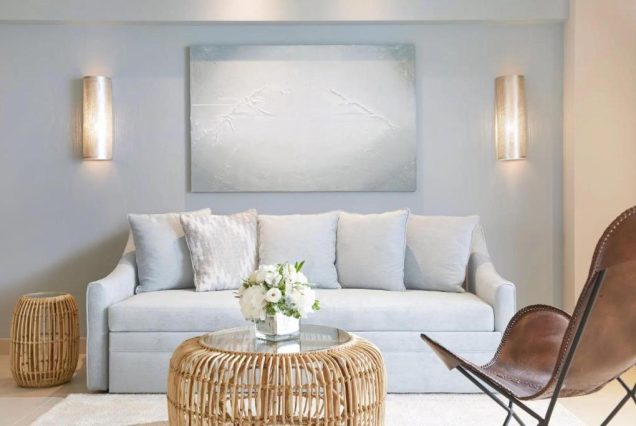 Интерьер: светлое дерево, текстиль, стекло, мягкие пастельные тона