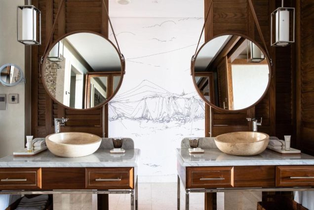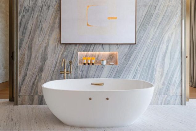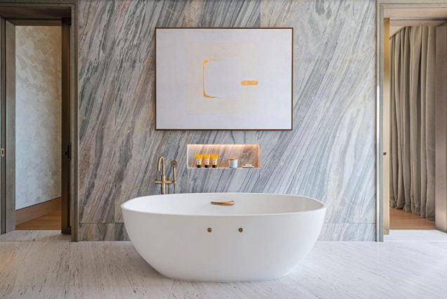 — Ванная: мраморная, ванна + тропический душ, халаты, тапочки, премиум-косметика