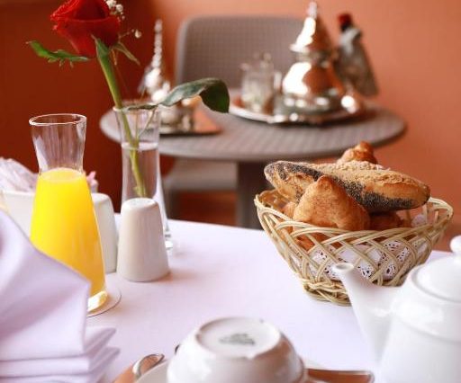 Меню: свежие фрукты, традиционные блюда (брик, мшель), омлеты, круассаны, домашняя выпечка, смузи, натуральный йогурт, мюсли, травяные чаи и кофе.