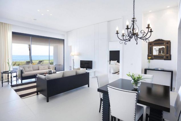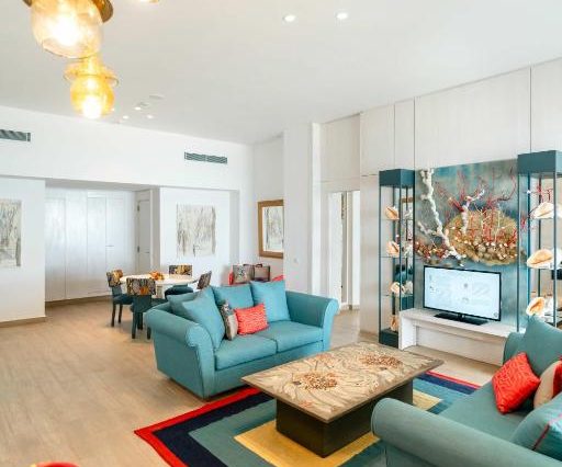 Панорама и архитектура: белоснежные корпуса, средиземноморские сады, вид на море и пальмы, минимализм с восточными мотивами