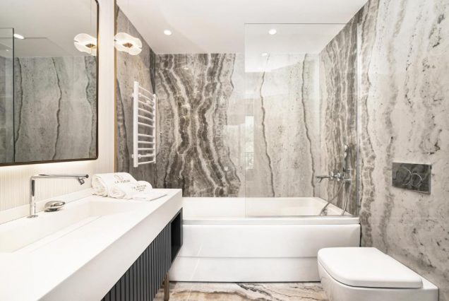 Санузел: ванна с гидромассажем, душевая с тропическим душем, двойная раковина, туалетные принадлежности премиум-класса