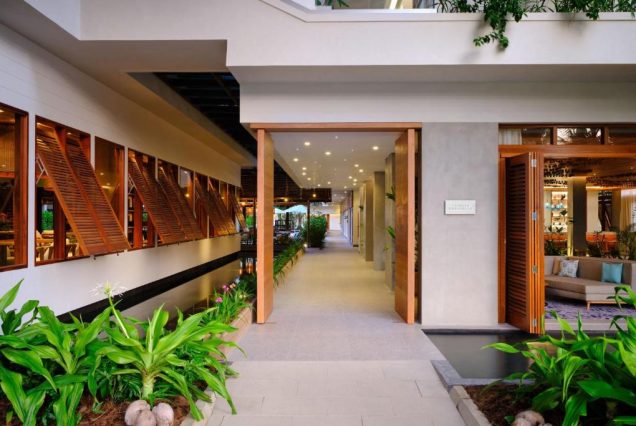 Вид из номера: на внутренний двор с зеленью и лаунж-зоной