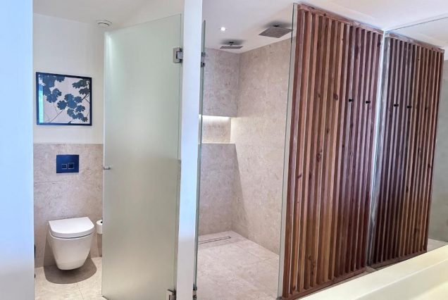 Санузел: ванна с видом, душ с тропическим эффектом, двойная раковина, премиум-сантехника