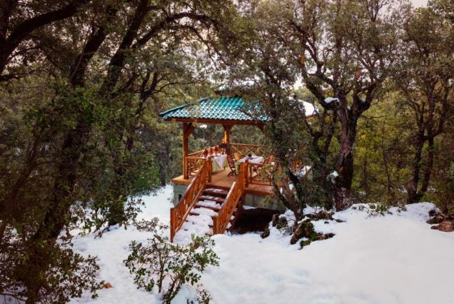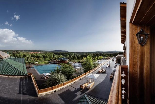 Панорама и архитектура: величественные Атласские горы, отель в альпийском стиле с марокканскими элементами, натуральные материалы, зелёные леса и скалы