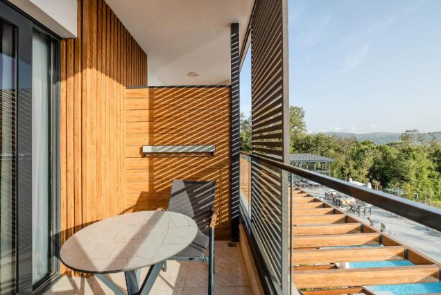 Балкон: панорамный, с шезлонгами, кофейным столиком, зонт от солнца