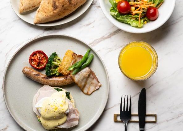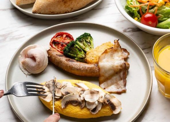 Меню: свежие фрукты, соки, яйца (любые виды), тосты и круассаны, каши, йогурты, мюсли, горячие блюда, кофе и чай