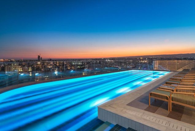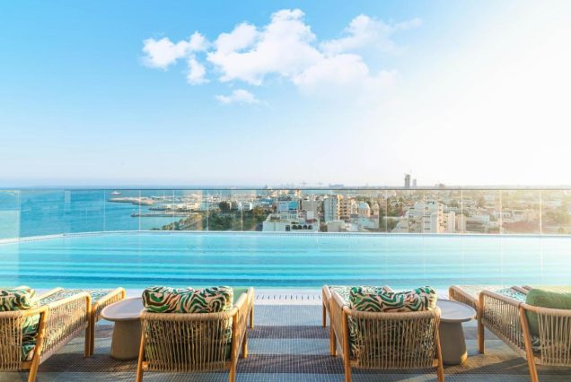 Бассейн на крыше с видом на море и центр Лимассола