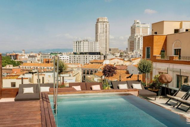 Бассейны: крытый бассейн с подогревом и зона отдыха на террасе с видом на Мадрид