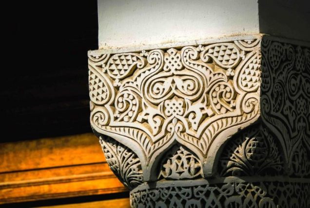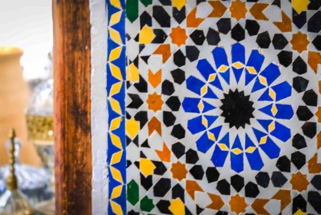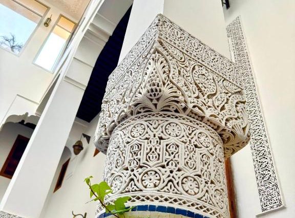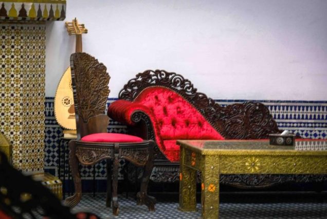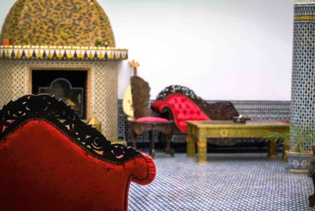 Интерьер: традиционный марокканский стиль — резное дерево, мозаика зеллидж, латунные светильники